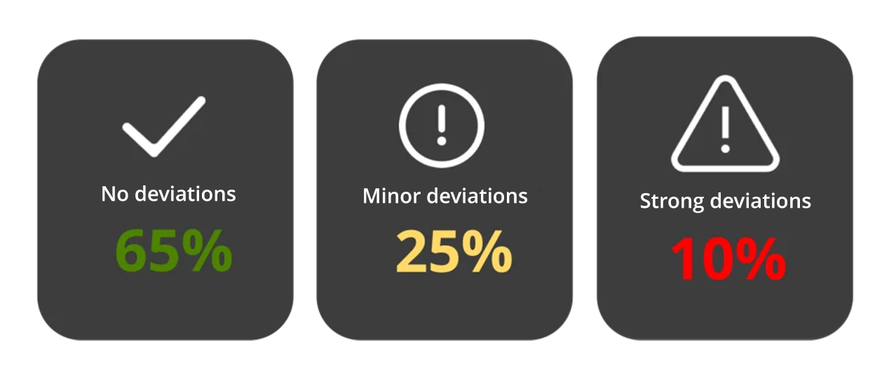 This way you can ensure that the correct reports can be approved quickly and time can be spent on correcting incorrect reports. Here you can see the result of how the deviation detection on average sorts data for companies. The function can find incorrect reports and reports with errors with up to 80% probability.